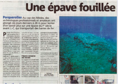 Sondage sur l’épave de la Grande Passe sous la tutelle du DRASSM du 20 au 30 septembre, 10m² ont été fouillés, nous avons localisé l’arrière de l’épave et du mobilier a été remonté. La météo a été favorable, nous avons eu une moyenne de 8 plongeurs par jour et nous avons réalisé plus de 110 plongées à 44 mètres.